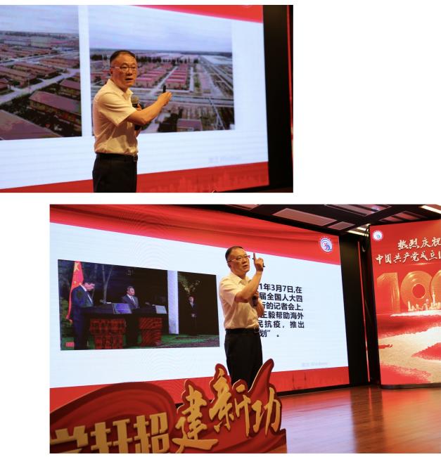 首先,全体教职工一起观看了庆祝建党100周年大会直播。大会上,中共中央总书记、国家主席、中央军委主席习近平发表了重要讲话。在这个十分重大而庄严的日子,他同全党全国各族人民一道,庆祝中国共产党成立一百周年,回顾中国共产党百年奋斗的光辉历程,展望中华民族伟大复兴的光明前景。他代表党和人民庄严宣告,经过全党全国各族人民持续奋斗,我们实现了第一个百年奋斗目标,在中华大地上全面建成了小康社会,历史性地解决了绝对贫困问题,正在意气风发向着全面建成社会主义现代化强国的第二个百年奋斗目标迈进。这是中华民族的伟大光荣!这是中国人民的伟大光荣!这是中国共产党的伟大光荣!