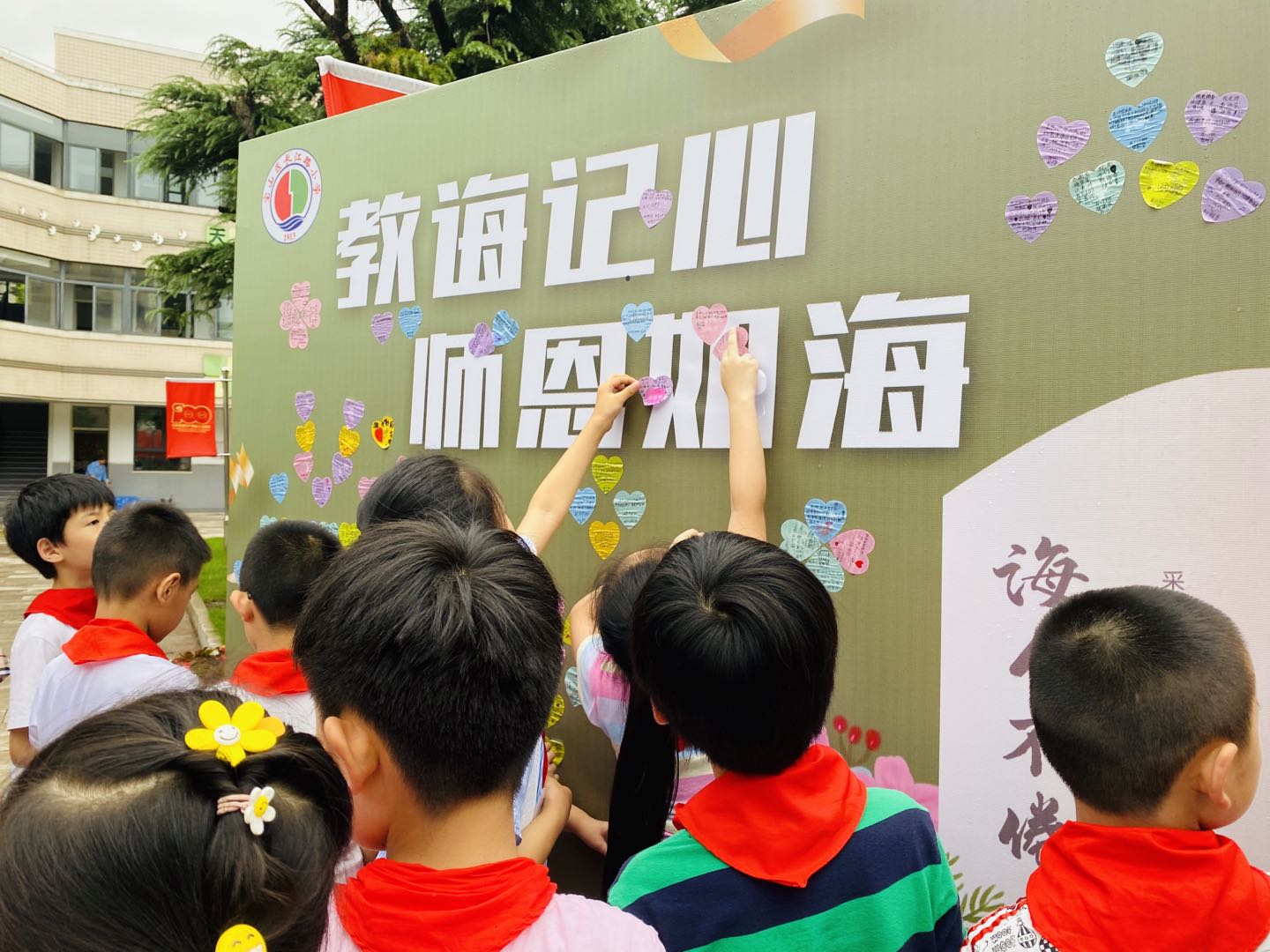 教诲于心 师恩如海。早上一走进校门,同学们就把对老师们的感谢和祝福写在了心形卡片上,贴在了祝福墙上。教室里,同学们为老师们深深地鞠上了一躬,并大声送上了祝福:祝老师们节日快乐!