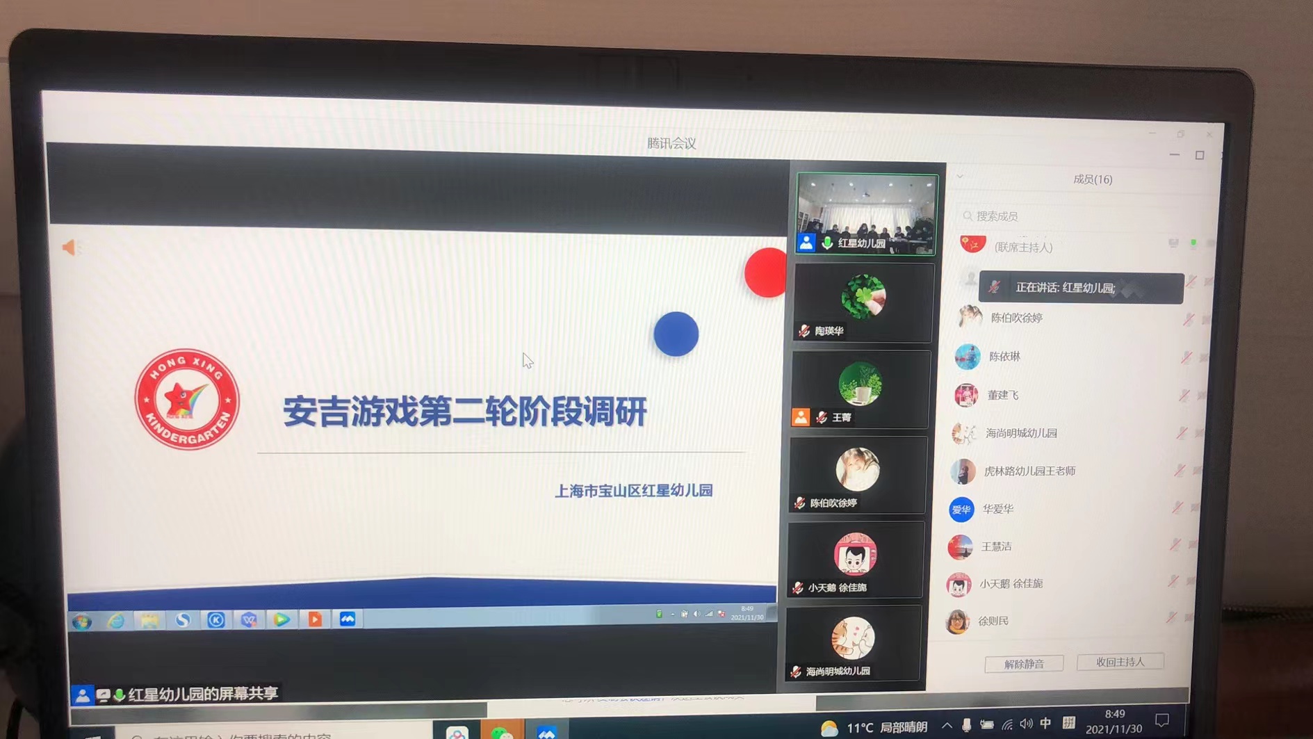 因疫情影响,11月30日上午“安吉游戏”项目研究第二轮阶段调研红星幼儿园专场由线下转为线上进行。华东师范大学学前教育系教授华爱华,上海市教委教研室幼特教部主任徐则民,市教研员王菁、贺蓉,宝山区教育局学前教育科科长郑莉,宝山区教育学院小幼教研室各教研员,各实验园园长及教师代表,宝山区游戏研究团成员等60余人在云端相见。