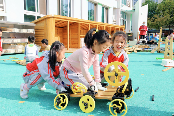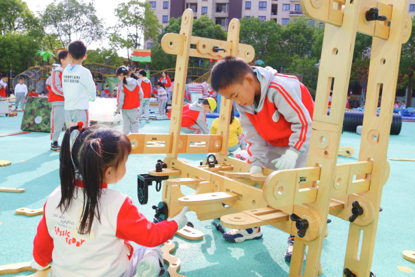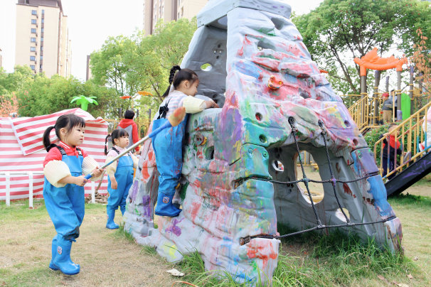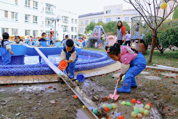 随着欢快的音乐声,罗泾镇中心幼儿园的户外自主游戏开始了,孩子们在自然、野趣、开放的游戏环境中,喜悦投入、探究创造、大胆冒险。老师们在一旁专注地观察、记录、倾听,尊重和保护幼儿在游戏中的好奇心和探究意愿,做到“最大程度的放手”,捕捉每一位儿童的“泾”彩时刻。