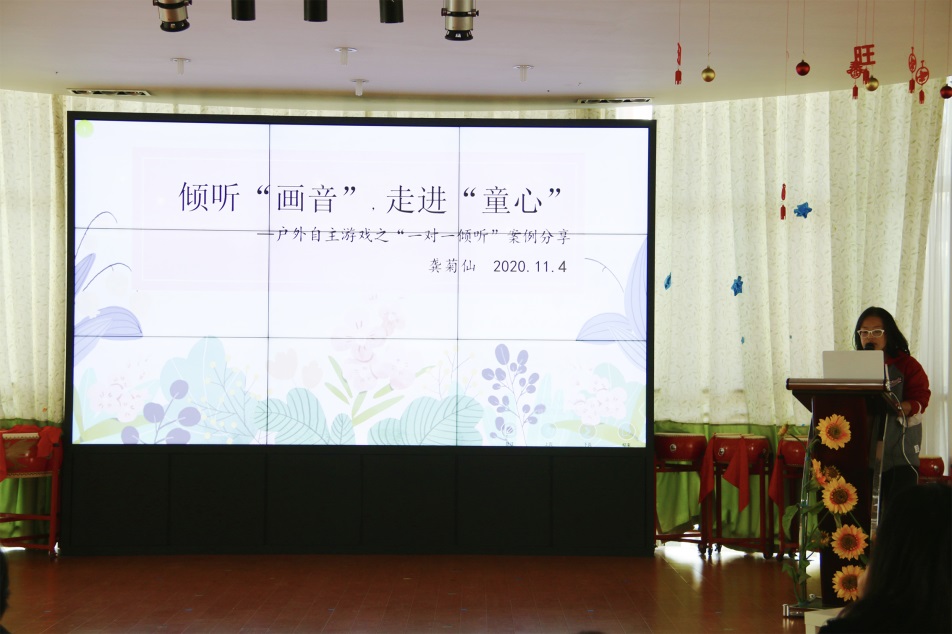 骨干教师龚菊仙老师分享了小班游戏案例:《倾听“画音”,走进“童心”》。通过持续性地拍摄与记录幼儿游戏现场视频、幼儿游戏后的漫画日记、幼儿对漫画日记描述的录音等实证,教师分析了小班幼儿无所事事背后真正的含义,让大家感受到了倾听能让我们走进“童心”,让我们对小班幼儿的想象与表达表现能力刮目相看,让我们不断加深对儿童的认识,发现儿童的无限潜能。
