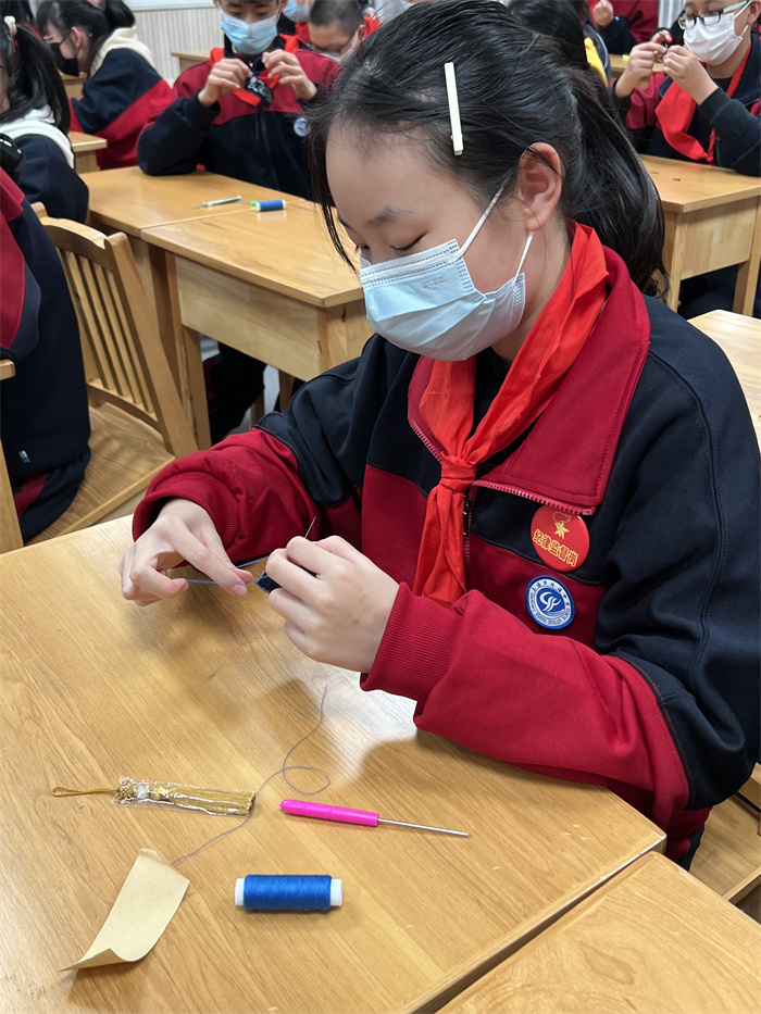 学生们有的潜心研究细细琢磨,有的跟着指导老师一步一步慢慢学,还有的围成一圈讨论细节,互相汲取经验。小小书签,看似易做,实则对同学们的耐心与细心要求极高。