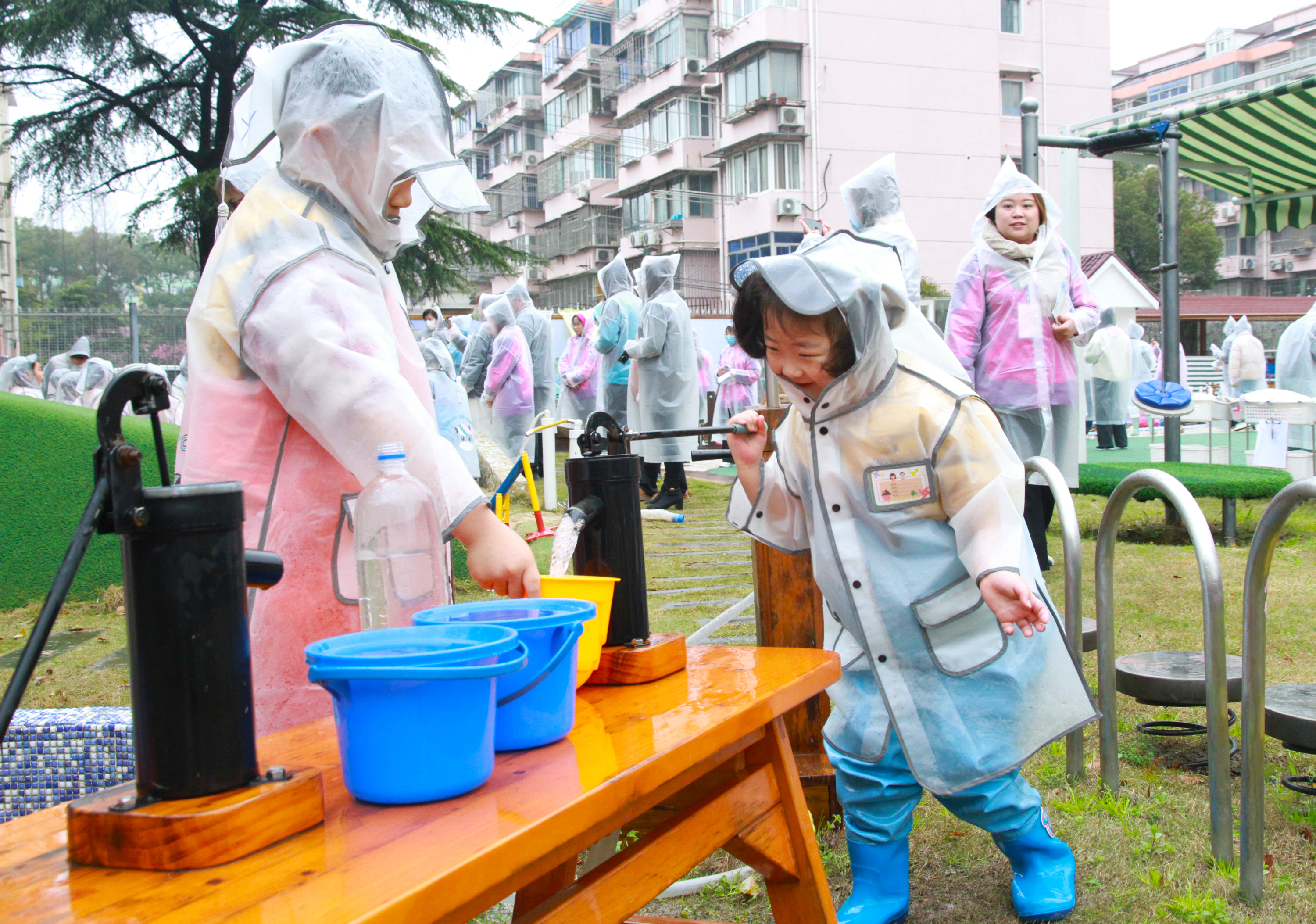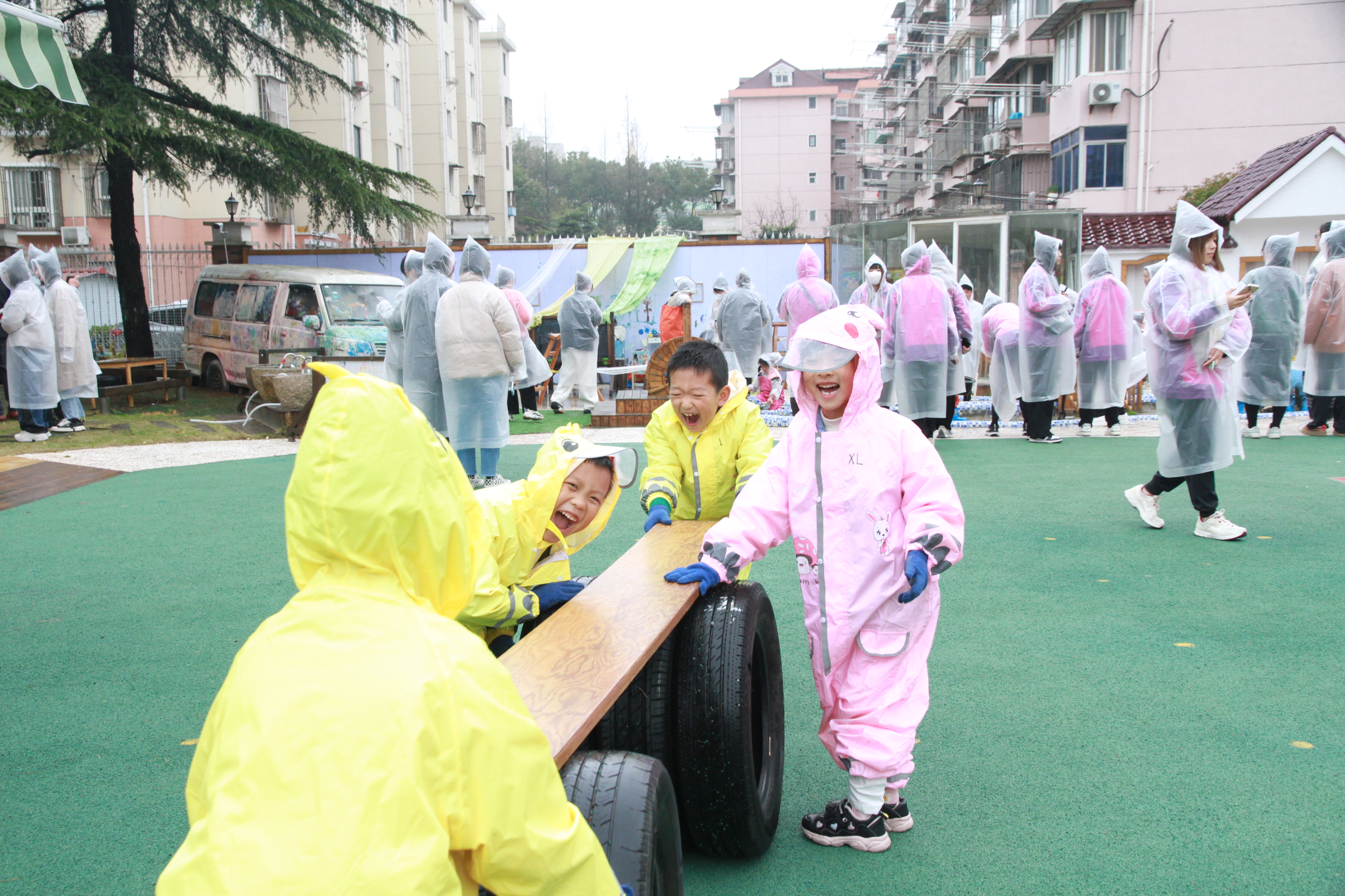 春雨淅淅沥沥地下着,穿上雨披雨鞋的孩子们感受到了不一样的游戏体验,小雨成了他们游戏的新情景,草坪上忙碌的蚯蚓带给了他们新的畅想;如何防滑,如何在雨中玩得既尽兴又安全,孩子们在不断地思考与探索。在这里,与会人员看到了孩子们自主愉悦、快乐探索的户外游戏状态以及教师基于儿童视角的信任、陪伴与观察。