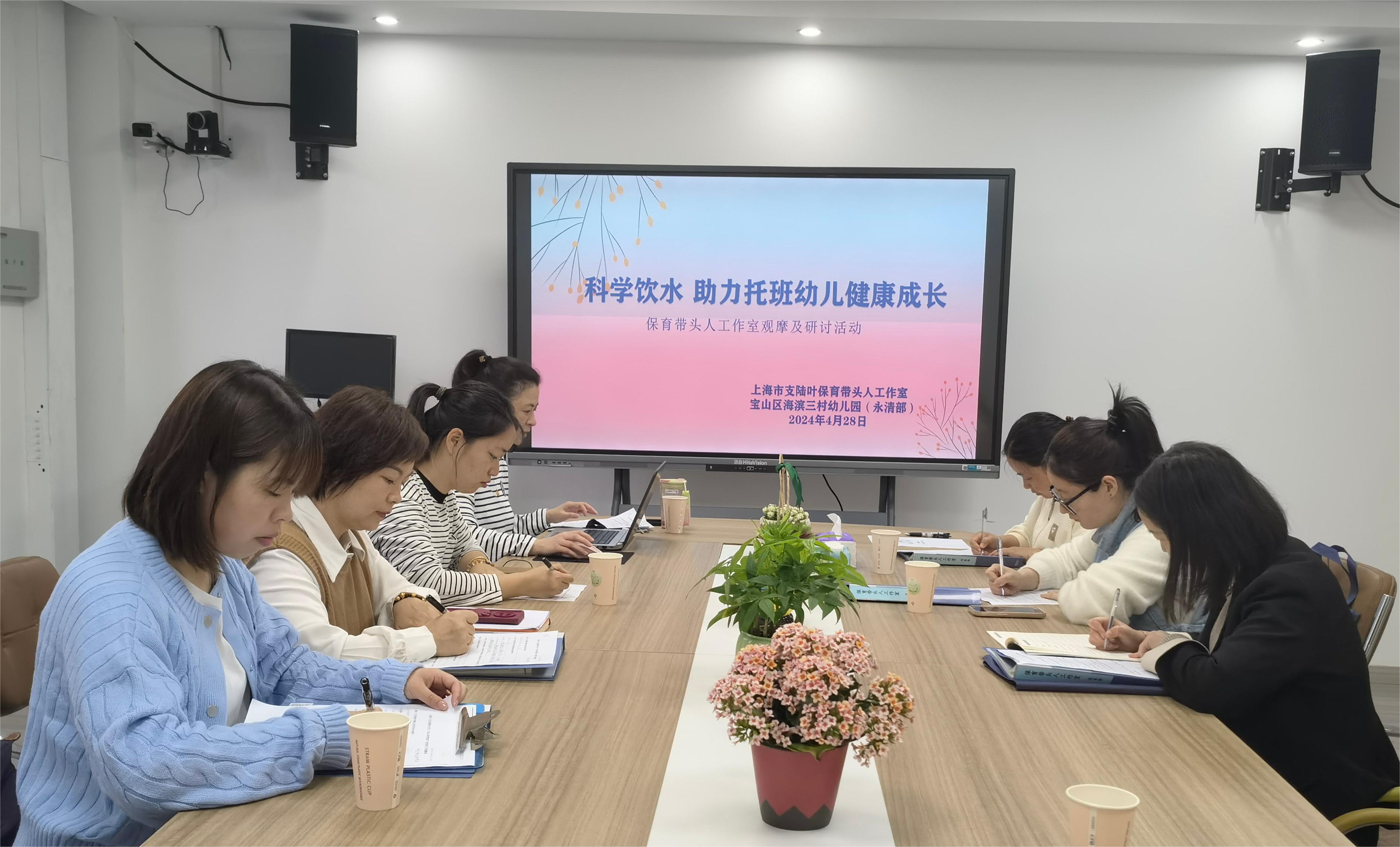 4月28日上午,上海市第二批保育带头人工作室“支陆叶保育带头人工作室”的6位成员齐聚海滨三村幼儿园分园永清部开展工作室活动。本次活动是以现场观摩和交流研讨相结合的方式,观察记录幼儿园半日生活中托班幼儿的饮用水现状,并对前期关于“2-4岁婴幼儿科学用水调查问卷”进行汇总分析,从“幼儿发展优先”的视角进行交流研讨。