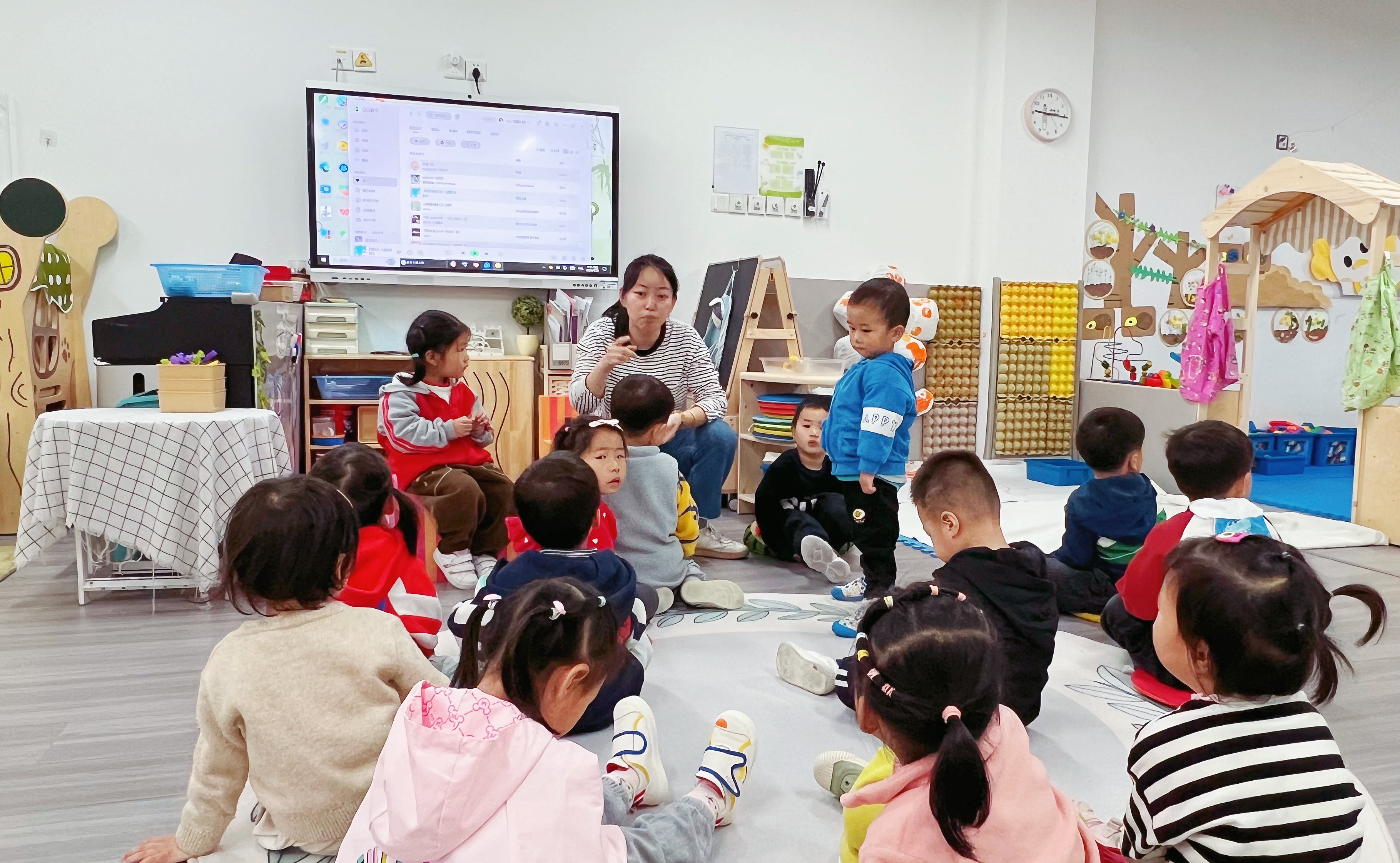 与会人员首先观摩了王婷老师带领的托班半日活动。从现场可以看到,海三幼儿园的托班老师为孩子们创设了温馨、安全、自主、充满爱的互动环境,在教师和保育员对幼儿的回应性照护中,与会老师感受到了常态化的自主氛围及幼儿良好生活自助能力的形成。各个环节的展示,不仅让工作室的成员看到了托班孩子在园内半日生活、游戏的真实现状,也进一步熟悉了解了托班幼儿保育工作开展的重点和要点。