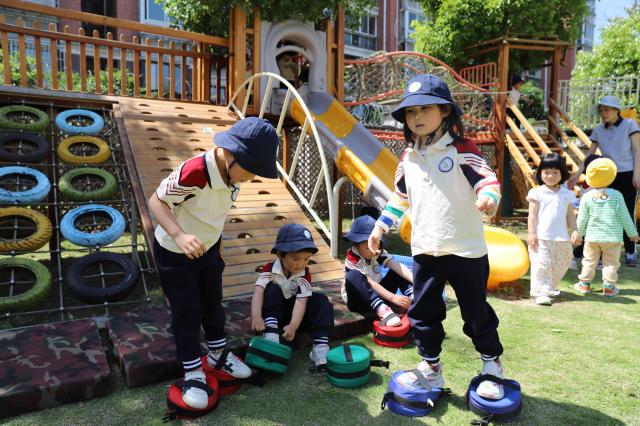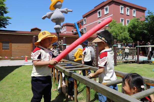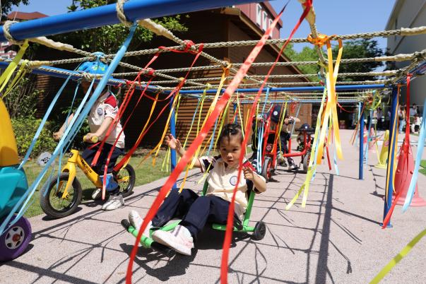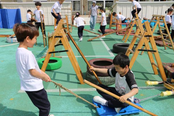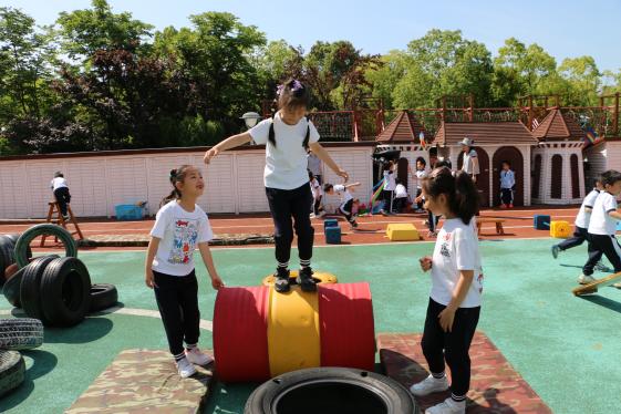 中班、大班的哥哥姐姐们大胆尝试,油漆桶、旧轮胎、竹梯、垫子……各种简单的材料在孩子们的手中自由组合搭配,空旷的操场眨眼间就变成了充满运动活力的欢乐场。