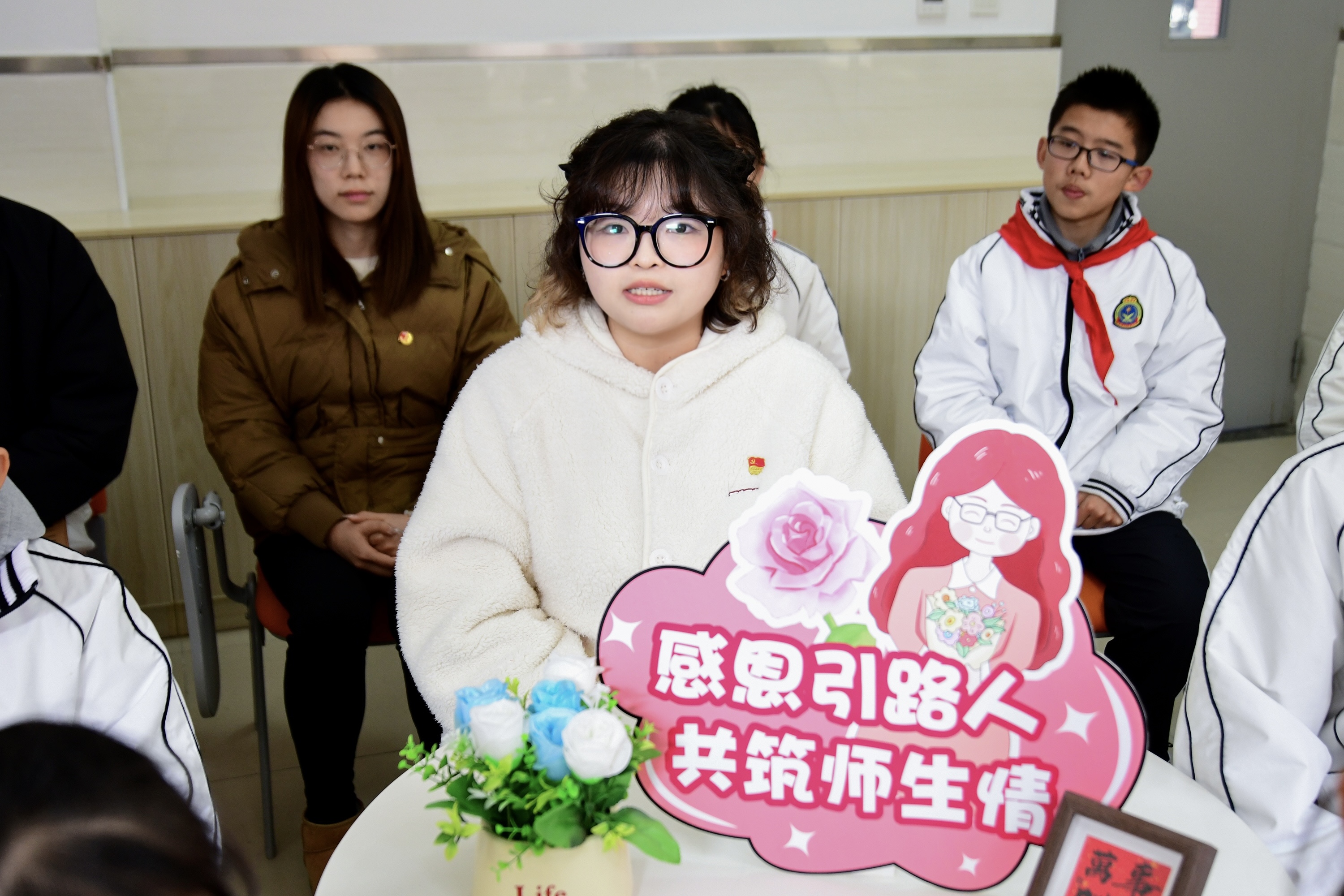 畅谈会由团总支委员陶玉洁老师主持,队员代表熊子鑫和何羽芊表演诗朗诵《杏花春雨 师爱不已》。队员们结合亲身经历,讲述喜欢的教师形象,并对老师提出新年期望。