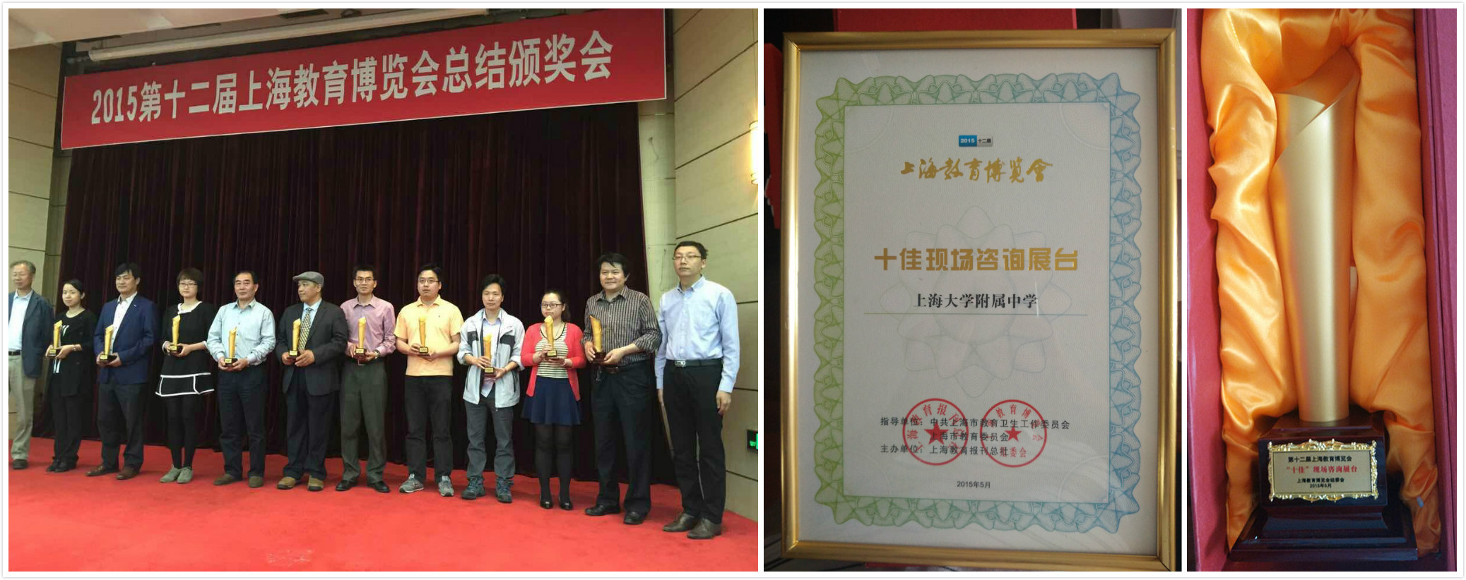 5月28日下午,2015第十二届上海教育博览会总结颁奖会在上海理工大学举行。市教卫工作党委副书记、市教委副主任高德毅等领导出席会议,来自上海市高校、区教育局和上海市属中学、企业等参展单位的代表参加了会议。大会对本届教育博览会参展工作进行了总结,参展单位代表做了交流发言,并对获得“十佳”现场咨询展台等荣誉称号的单位进行了颁奖。在为期四天的展会上,上大附中社团学生以灵活多样、丰富多彩的互动向广大市民及青少年朋友展示近年来学校资优生培养的丰硕成果,获得了现场观众的高度认可,并从六十多所实验性示范性高中及特色高中中脱颖而出,荣获了“十佳”现场咨询展台称号。本届教博会获得“十佳”现场咨询展台的学校还有:上海中学、七宝中学教育集团、上海实验学校、复旦附中、华师大二附中、交大附中、控江中学、同济一附中和复旦中学。