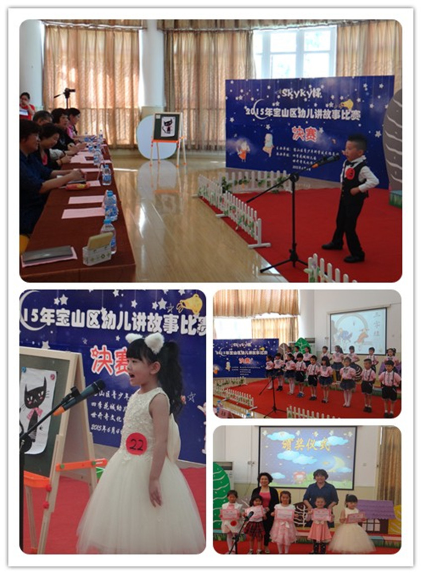 2015年6月4日上午,由宝山区少科站主办,世开齐文化传播、四季花城幼儿园承办的“Skyky杯”宝山区幼儿讲故事决赛在四季花城幼儿园举行。来自宝山区11家幼儿园的22名参赛小选手们共同角逐“故事之星”特等奖。