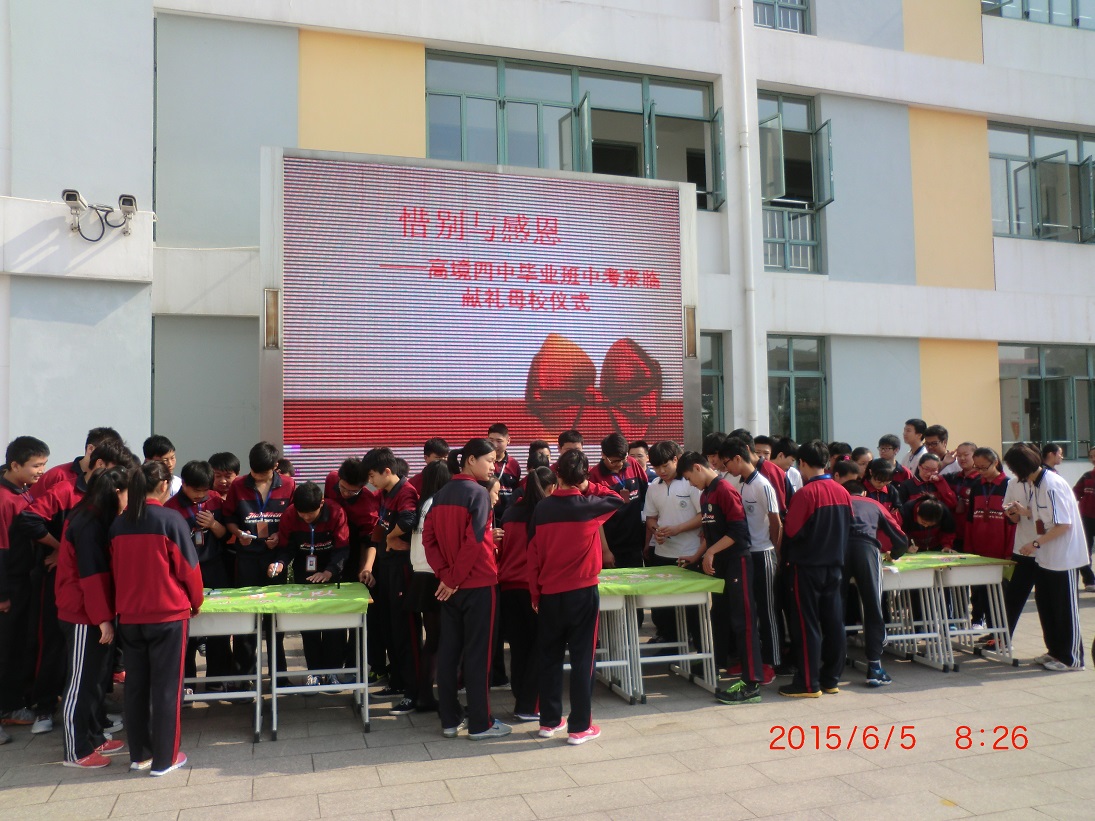 为表达对母校的感激和惜别之情,近日,高境四中的全体毕业班同学举行了一次特殊的升旗仪式——毕业班中考来临暨献礼母校仪式。