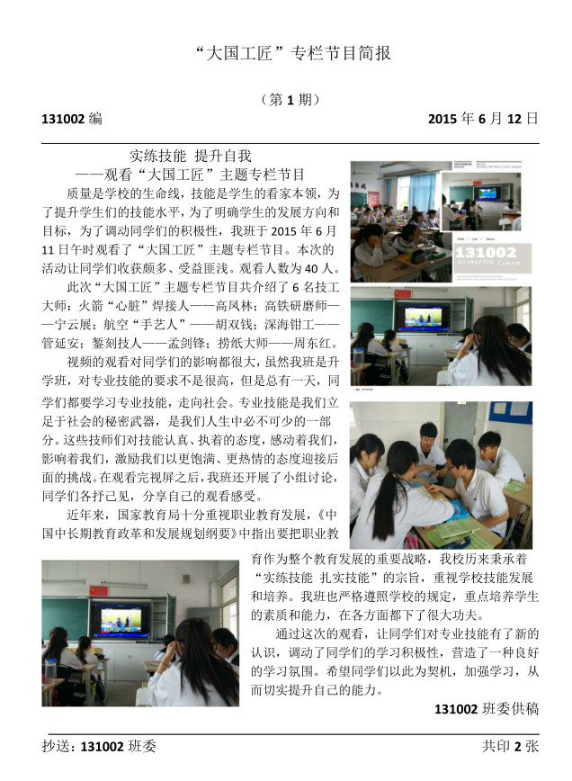 最近根据市教委的要求,上海市宝山职业技术学校组织全校师生观看学习中央电视台的特别栏目——《大国工匠,匠心筑梦》。