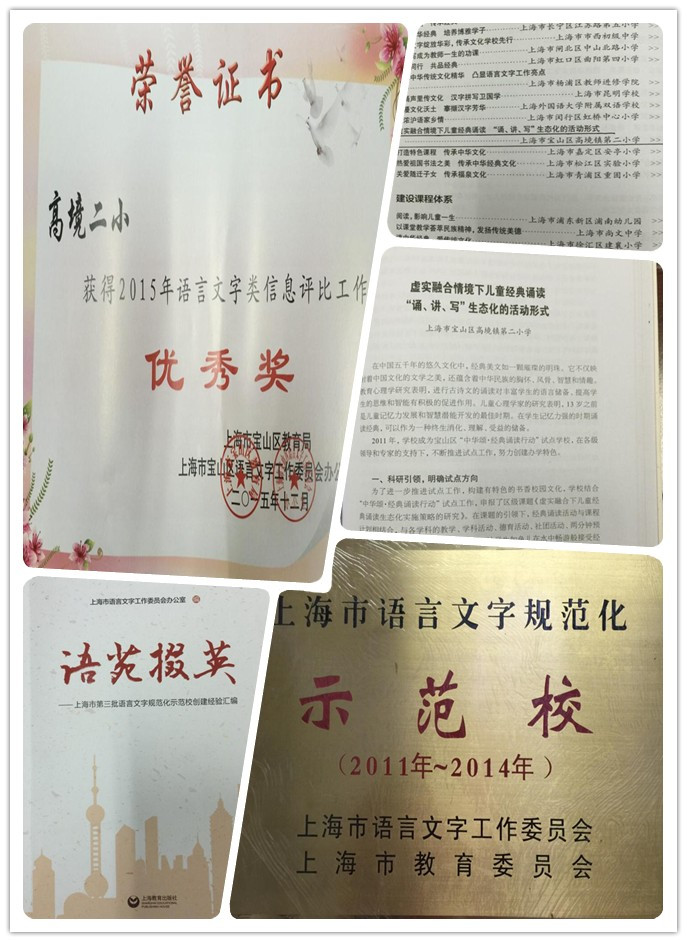 上海市语言文字规范化示范校的光荣称号,既是对近年来二小语言文字工作的肯定,也对二小今后开展语言文字工作提出了更高的期望。二小的经典诵读行动的经验总结作为学校特项目,其经验总结《虚实融合下儿童经典诵读“诵、讲、写”生态化的活动形式》被市语委办汇编入《语苑掇英——上海市第三批语言文字规范化示范校创建经验汇编》一书中。此外,二小还因为积极向宝教网、高境镇网络平台、《青年报》、《高境报》等报送我校语言文字工作的信息,因此,高境二小又荣获2015年语言文字类信息评比工作优秀奖。