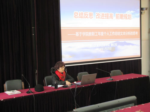 在报告中她阐述了阅读教师个人年度工作总结的初衷,那就是“了解教师个体工作完成的质量,关联学院整体工作目标的达成情况;梳理教师工作思考的脉络,评估‘用研究的方式开展工作’的落实情况;把脉老师聚焦热点难点问题,明确学院整体工作改进方向”,并按照“多维扫描,点面结合”原则阅读分析全体教职工的个人工作总结。在此基础上,提出要以“研究”为特征进行工作总结的改进思考与策略。