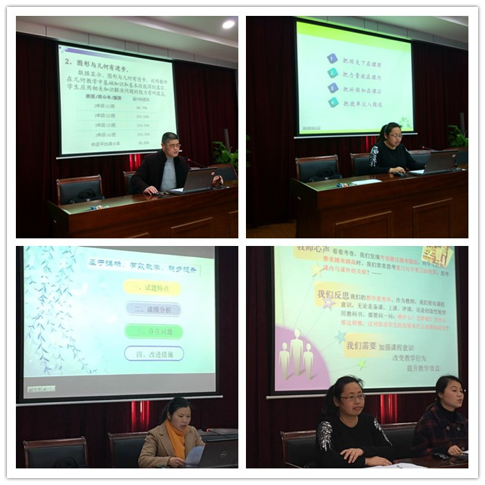 首先由语数英三位分管领导做第一学期期末考试质量分析,他们从整体情况入手,详尽、细致地分析了考试中体现出的优势和存在的问题,并提出了改进措施。随后,教导主任向全体老师提出了提高课堂效率的要求,希望老师们把功夫下在课前,把力量放在课内,把补困加在课后,把效率注入精选。