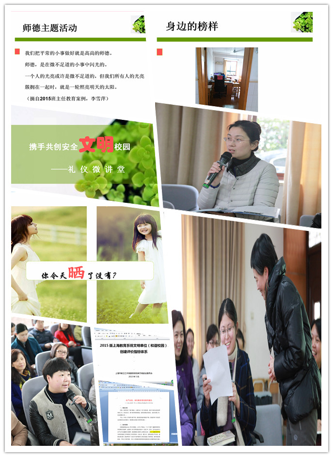 接着,校领导重申《上海教育系统文明单位(和谐校园)创建评价指标体系》,重点结合师德建设进行介绍。学校将深入开展“小问题,大礼仪;小细节,大师爱”主题活动,倡导教师们怀大爱心,做小改变。校领导弘扬了身边的榜样,要求党员、组长、骨干教师以身作则,围绕学校讲规范、重文化、强特色、提品质12字目标,从读好书、写好字、做好操、用好餐、扫好地这些小细节做起,为学生做示范。