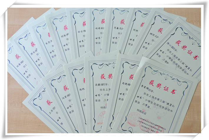 大华二小学生在上海市第3届“读写新天地“现场写字比赛中,赵鸣、贾祎柯、南雨好三人荣获一等奖,吴欣睿等12人获得二等奖,廖睿阳等42人获得三等奖。
