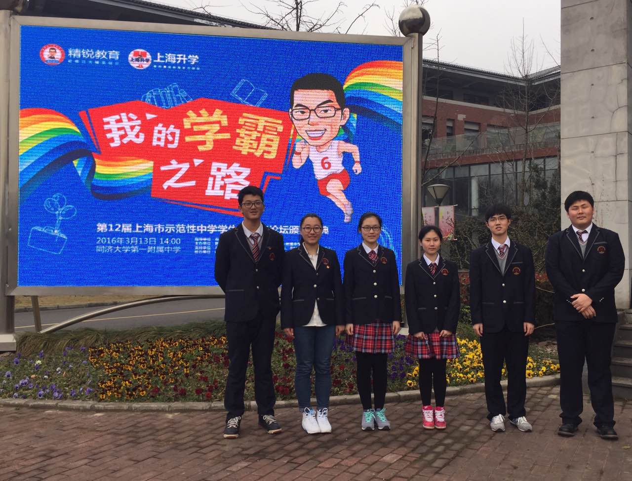 2016年3月13日,我校周恩宇、金巍玮、徐新蕾、陈欣黎、肖正衍及李叔元同学受邀参加了“实践,追寻梦想的脚步”第十二届上海市示范性中学学生会主席论坛闭幕式暨“我的学霸之路”论坛。