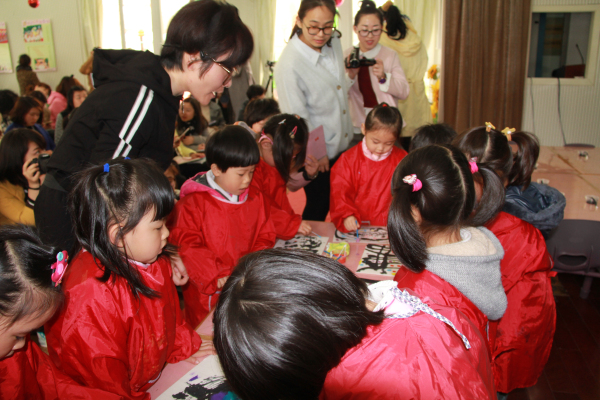 开放活动中,七色花的两位青年教师展示了两个偏美术领域的集体学习活动,两个美术活动都重视让幼儿在充分感受和欣赏基础上进行大胆的创作与表现。其后,幼儿园又为研修班成员开放了美术创意室活动及个别化学习活动,让幼教同行能够从不同的维度进一步感受《指南》精神在幼儿园美术领域教育活动中的落实。