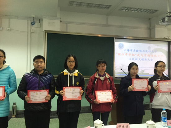 2016年3月26日,由上海市中小学德育研究协会、实验性示范性高中德育管理专委会、青年报、学生导报联合举办的“控江中学杯”“我与中国传统文化”征文评选活动揭晓,我校从参赛的42所学校中脱颖而出,获得优秀组织奖。我校共有四位同学获奖,来自高二(1)班由孟雅婷老师指导的顾刘杰获得了一等奖,来自高三(5)班由崔雅章老师指导的吴妍旻和陆晶分获二等奖和三等奖,来自高二(7)班由邬彦影老师指导的范翱获得三等奖。