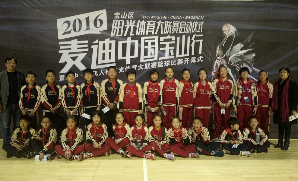 3月30日,进修实验学校五年级部分学生在老师的带领下,穿着整齐的校服,戴着鲜艳的红领巾,参加了2016麦迪中国宝山行——阳光体育大联赛启动仪式。