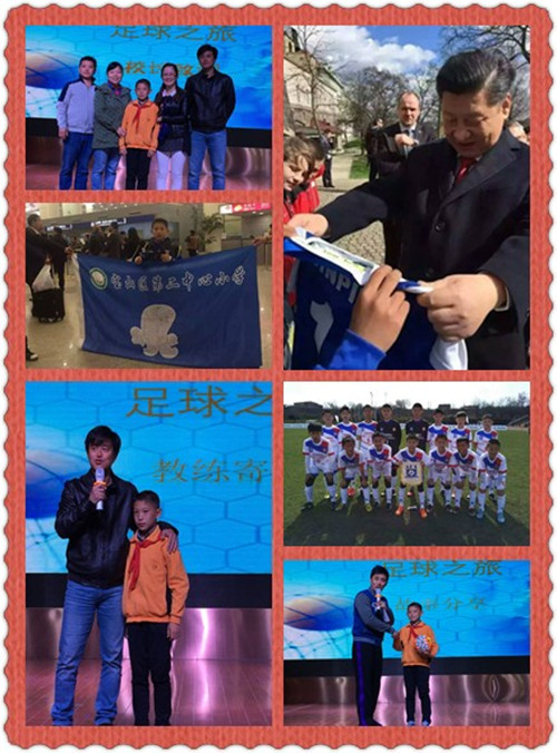 周威同学回国后,学校专门为他举行了欢迎仪式。在台上,他跟全校师生分享了其在捷克训练、踢球的经历,同时,分享了在捷克踢球时,与国家主席习近平握手、交流的情形。这一幕成了他今后努力踢球、学习的动力。家长、教练员、班主任、校长等代表一一在台上发言,鼓励他、支持他,希望他朝着自己的目标奋斗。