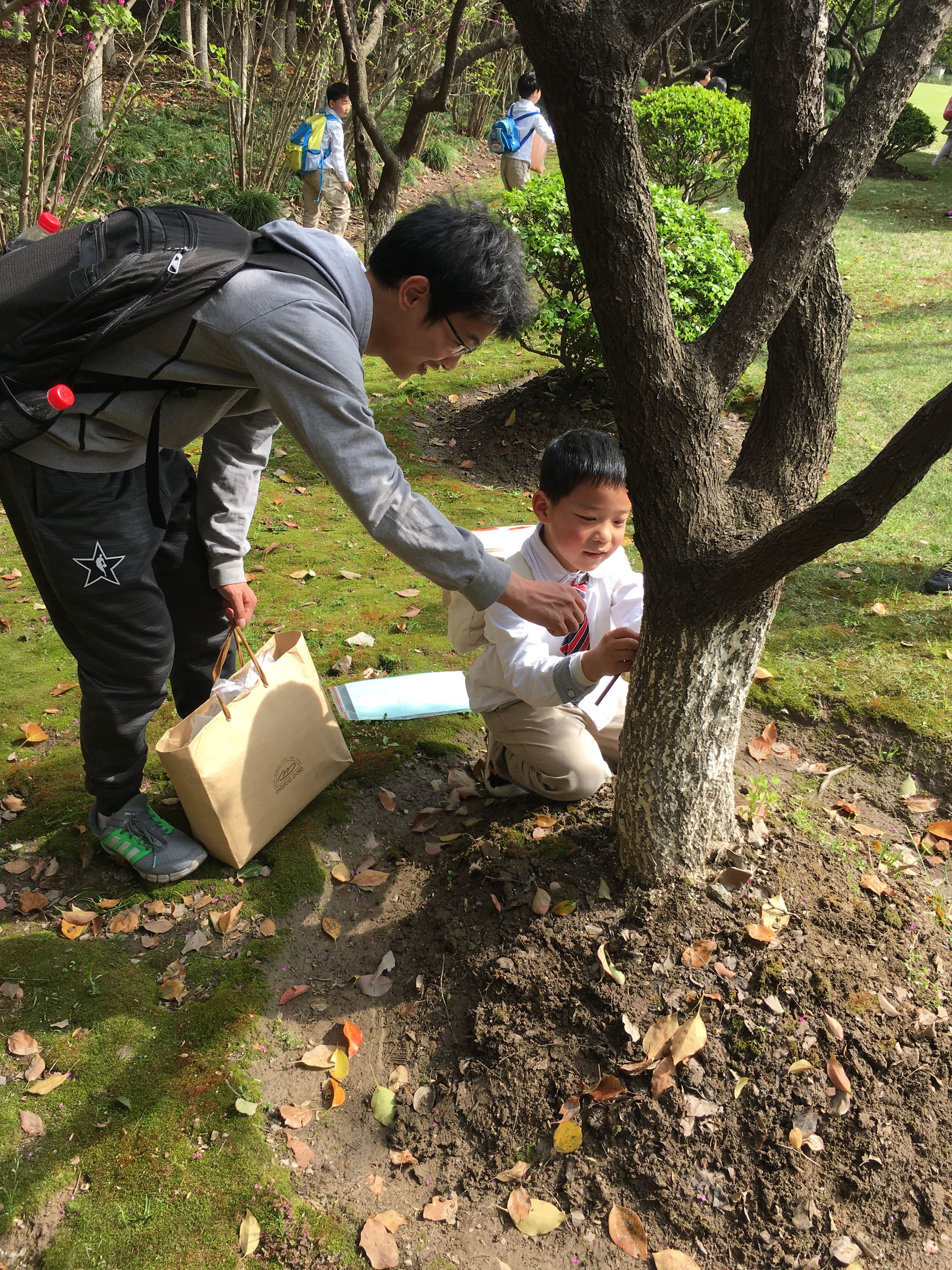 走进美丽的大学校园,孩子们和哥哥姐姐合作一起寻找沿途的不同落叶,丰富了对植物的认识;他们还尝试用彩色铅笔和磨砂纸记录下树干的纹路,感受树木的形态;最后哥哥姐姐们还在草坪上和孩子一起玩起了童年游戏,感叹童年是最美好的时光。