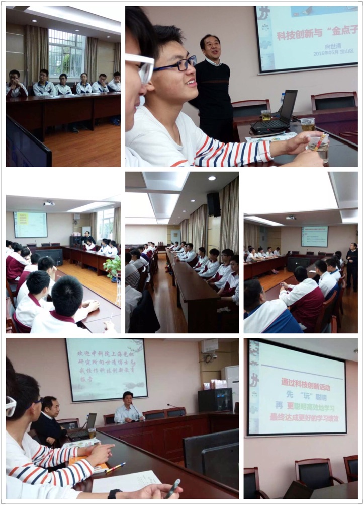 目前,我区科技教育实践活动正如火如荼地开展,区科技教育推进大会也正积极准备中。为此,我校积极响应,5月9日很荣幸地邀请到中科院上海光机研究所向世清博士为我校高中学生作了一堂——“双创时代”创新教育与金点子的科技教育讲座.