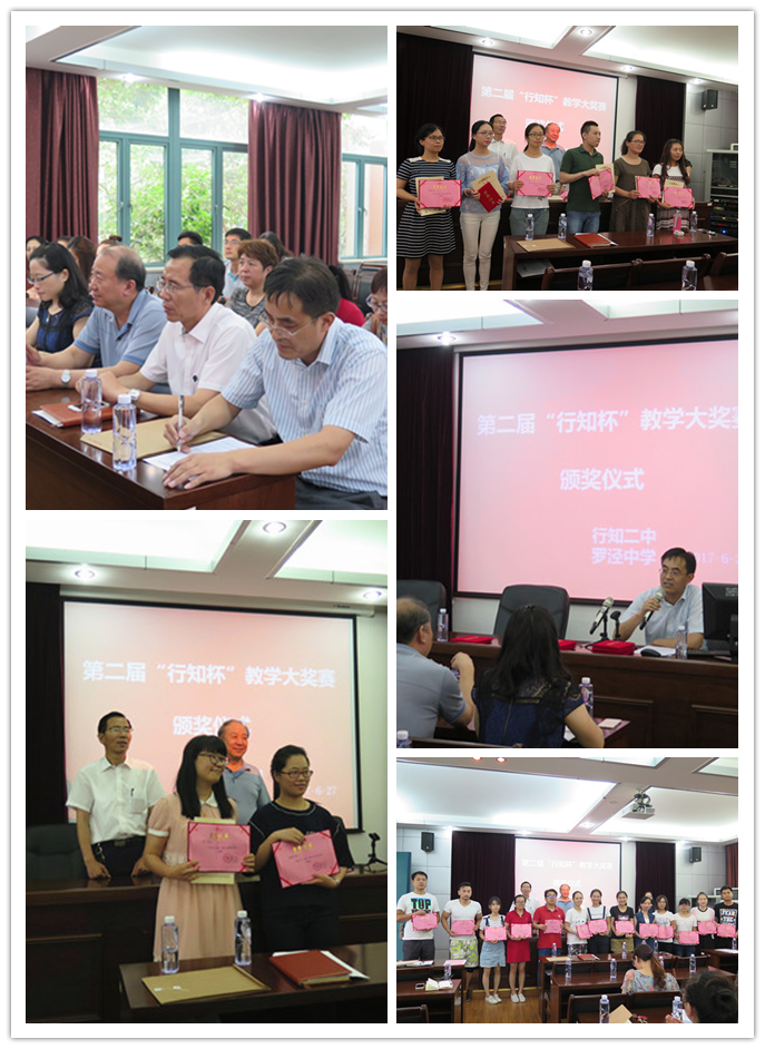 活动分为两个议程,第一个议程是第二届“行知杯”教学大奖赛的颁奖活动。第二个议程是上半年的活动总结。上半年,两校合作举办了第二届“行知杯”教学大奖赛。本次大奖赛共有24位教师参加,通过初赛、决赛,有2位教师获得了一等奖,6位教师获得了二等奖,16教师获得了三等奖。本次的颁奖仪式由罗泾中学沈校长主持,区教育学院教研室杨建钢副主任作主要发言。杨主任回顾了整个大奖赛的赛程,对参与比赛的教师及其教学设计和课堂教学进行了点评。他认为参赛教师们的教学设计规范、详尽,教师通过准确地学情分析,采用多样的教学策略来引发学生的认知冲突,提升学生的思维品质。对于参加决赛的教师们,他觉得教师具备优秀的素质,课堂调控能力强,教学活动的组织能体现课改的理念。之后,杨主任针对今后的教学阐述了一些建议。他希望教师们能够多研究中考导向,转变观念,营造良好的师生关系;课堂教学中要讲究实效,关注学科本质,促进学生全面发展;教师们要求创新意识。最后,行知二中的副校长宣读了获奖名单,两校的校长给获奖者颁发证书。