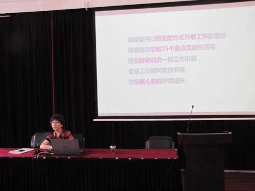 随后,曹红悦院长做了题为《积极探索教研训合一的工作机制 提升学院核心竞争力》的学期工作总结。本学期学院继续坚持以研究的方式开展工作的理念,深度推动学院25个重点项目的落实,探索教研训合一的工作机制,各项工作顺利有序开展,学院核心职能持续提升。