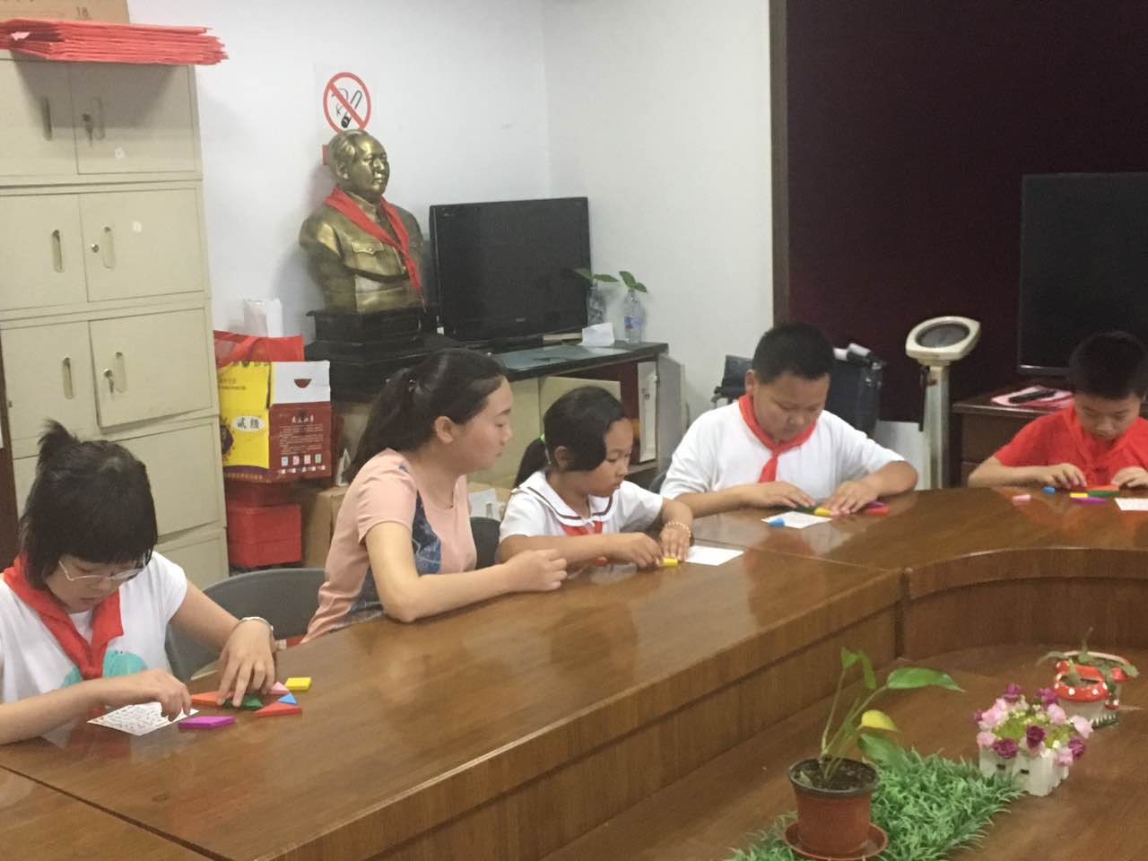 近日,泗塘新村小学同学们在社区工作人员及学校党员们的带领下,来到新桥居委会体验七巧板的乐趣,党员老师们同时对社区里的孩子进行教学,同学们和孩子们其乐融融,社区的工作人员向同学们介绍了各行各业不同阶层的劳动者,让同学们深知劳动是最光荣的事情;大家兴高采烈地劳动着,虽然脸上流出了汗珠,但小脸上却露出开心的笑容。