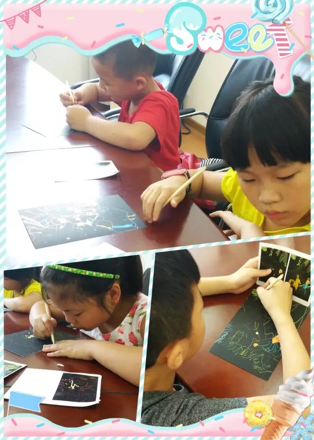 神奇刮画:今天,孩子们冒着酷暑按时来到学校参加本次暑期少年宫神奇刮画的活动。孩子们一个个埋头苦干,时而托腮思考,时而得意洋洋,他们都出色地完成了自己的作品,脸上洋溢着成功的喜悦。两个小时的刮画活动一转眼就过去了,神奇刮画活动不仅丰富了孩子们的课余生活,还带给他们亲手制作的快乐。