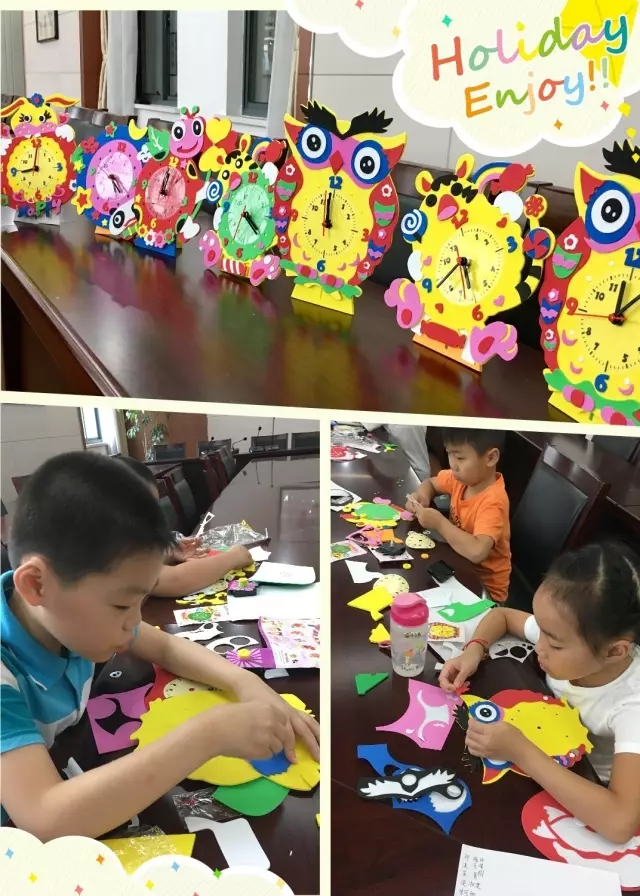 EVA手工时钟:窗外,烈日炎炎、骄阳似火,窗内却一片安静,孩子们正在专心致志地制作自己的EVA手工时钟。 认真黏贴、看图纸、比对、调整、固定……在一双双巧手下,诞生了各种各样的时钟,色彩斑斓、造型多变。