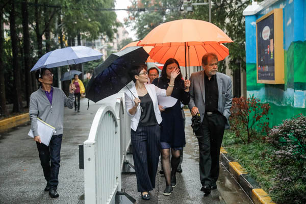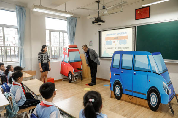 国际安全社区认证中心总干事Guldbrand Skjonberg(古尔邦.司琼博格)先生一行在校长徐妹兰的陪同下参观了学校与社区共同建设的学生上下学步行专用通道和校园,聆听了专用通道建设过程的演示汇报,并饶有兴致地一同与三年级学生进行学习互动,亲自参与到两车之间过马路的体验活动中。