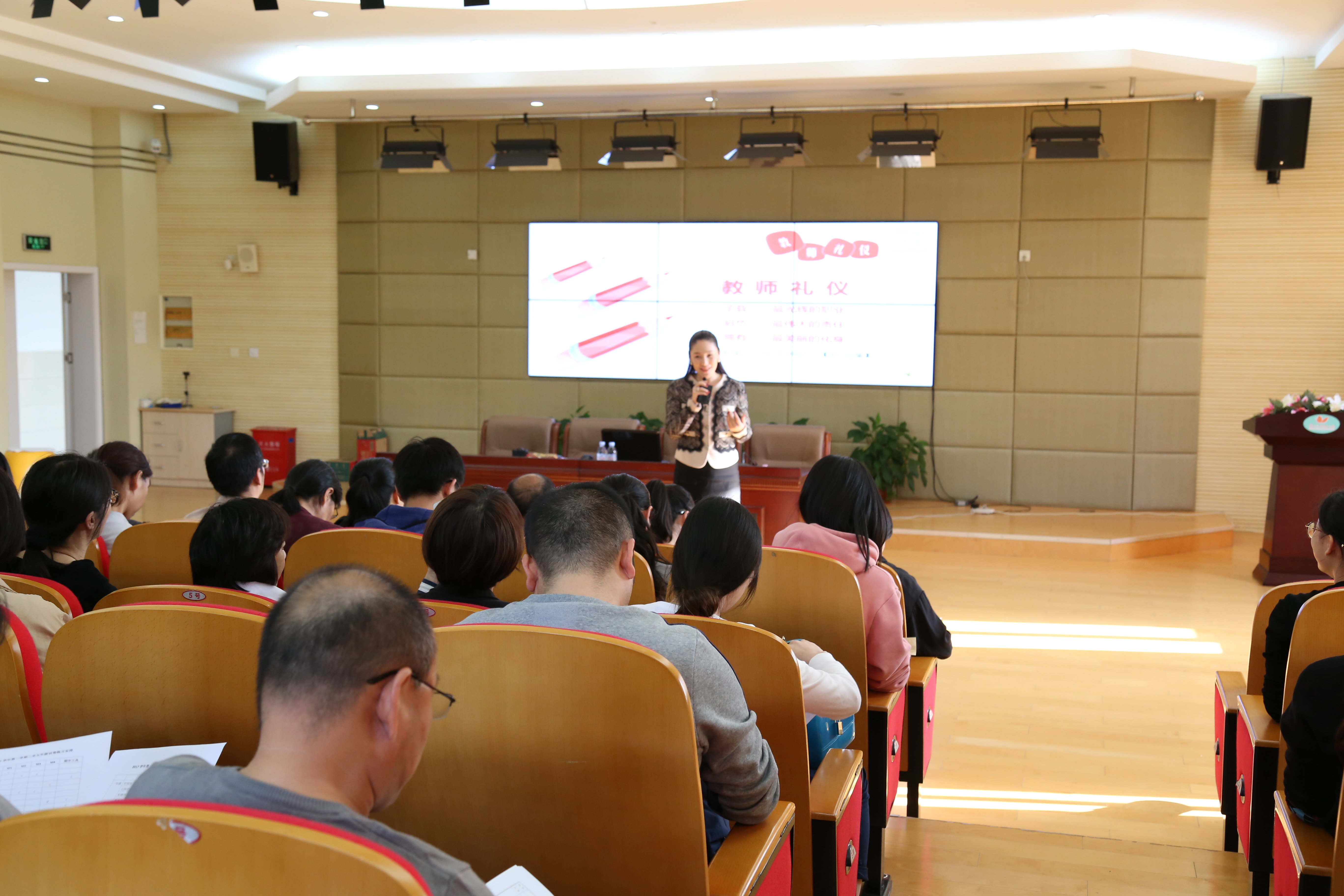张老师的讲座分为四块,第一印象“首轮效应”;魅力职业教师的专业形象;得体的场合穿着;职业装的基本搭配。整个培训过程中,张老师手持无线话筒,始终优雅地站着。一个半小时的时间,她通过真实形象的案例、自身的经验,从教师个人形象、仪表装扮、言行举止、职场交往等方面,多角度、深层次地阐述了作为一名教师应具备的礼仪品质。