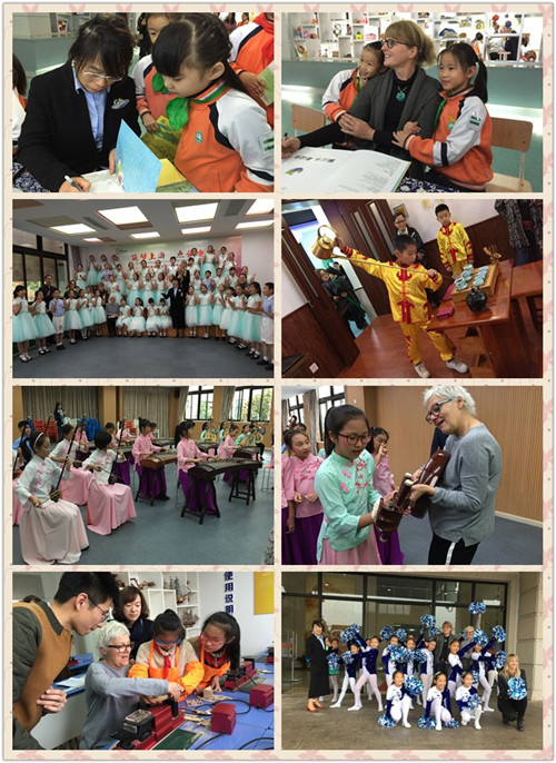 一进校门口,嘉宾们参观了学校的大厅文化并在手印板上拓印下了自己的手印及签名,这将作为二中心珍贵的礼物保留下来。随后,学校安排嘉宾们进行主题互动、社团活动、茶艺表演、艺术体验等四个环节。在主题互动环节,嘉宾们来到大拇指展览厅,参观了学生们自己动手、具有中外文学特色的作品书签、中国风团扇、超轻土作品、绘本插画等,兴之所至,嘉宾们与学生互动,亲手制作他们喜爱的团扇等,并在孩子们准备的作家书籍上签名,留下永恒而美好的纪念。接着是茶艺表演,孩子们在外宾面前娴熟地表演茶艺、礼貌地斟茶并邀请嘉宾品尝了具有中国特色的糕点,让他们在品尝的过程中了解中国文化与美食的源远流长。随后,参观团来到了二中心“创娃空间”,在这里一个个社团正在进行活动,消防体验区、益智思维区、安全互动体验中心、创新屋、科技走廊等,嘉宾们一路走一路看一路体验,不住地伸出大拇指,连连夸赞孩子们聪明、能干。特别是嘉宾来到“小木工”坊,看到学生们在独立操作机械设备,他们也忍不住要求试试,在孩子们的帮助下,一件件精致的木工作品完成了,最后,嘉宾们来到学校艺术教室,聆听了民乐社团的孩子用古筝、柳琴、中阮、二胡合奏的《茉莉花》,合唱《渔歌子》、《行香子》两首曲子是由我国唐诗改编而成的歌曲,孩子们浅浅吟、轻轻唱,最后一曲《友谊地久天长》与所有嘉宾一起合唱、一起合影,留下最美好的一刻。