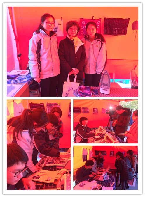 在展示现场,同学们展示了扎染的基本流程:准备布料、扎件的基本四种折法、基本扎法和煮染,最终完成一块自然古朴的扎染布。随后又展示了创作部分——同学们运用数码布艺裁切机完成了一束花、抽象画实用化的扎染布设计,然后再将贴布热贴膜的扎染布用刮铲贴合于标准年粘纸板上,再将裁切设计图案熨烫在衣服上,完成了运动服、环保袋、抱枕等物品的制作。现场引来了很多参观者,他们颇有兴趣地了解制作工艺,有的也当场参与制作,获得了自己的个性化的产品。