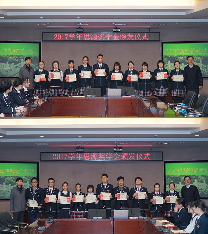 仪式开始,张校长为获得吴淞中学2017学年“思源奖学金”的30名品学兼优学生颁发荣誉证书,张兴先生为同学们颁发奖学金,并合影勉励。