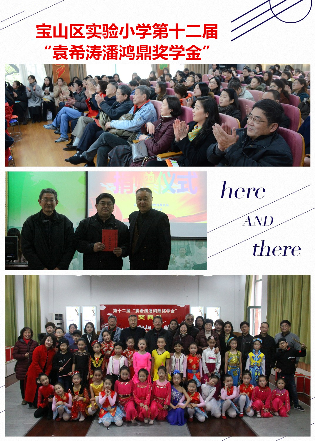 2017年岁末,第十二届“袁希涛潘鸿鼎奖学金”颁奖典礼在宝山区实验小学举行。出席本次颁奖典礼的嘉宾有:学校创始人袁希涛、潘鸿鼎先生的后人,宝山区教育局基教科,友谊学区领导,温州商会代表,街道社区代表,宝山康复俱乐部代表以及获得奖学金和提名奖的45位学生家长。
