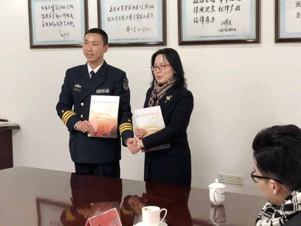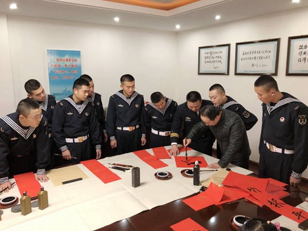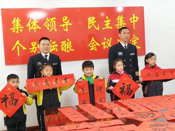 “金鸡展翅高飞去,玉犬奋蹄欢奔来”、“挥毫泼墨送春联,军民共建鱼水情” 等一幅幅红红火火、由我校师生亲手书写的春联被淞滨的小墨童们送到了海军叔叔们的手中。春联书香浓墨,洋溢着浓厚的新春气息,军地双方还进行了书法学习和交流,接待室里被欢快、祥和的气氛所包围。共建部队军方领导代表全体官兵表达了对学校一行来访慰问的谢意,表示将进一步加强与淞滨路小学的联系沟通,支持学校发展,促进军校合作,提升共建内涵。