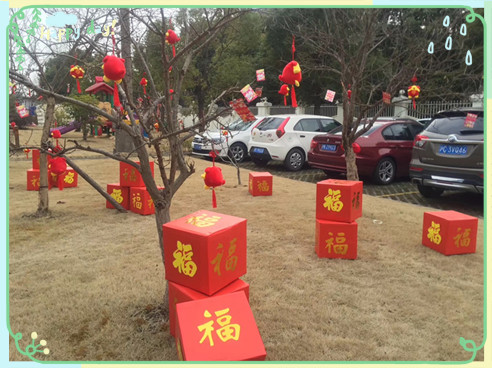 孩子们即将迎来了新学期,满天星幼儿园的老师们提前为孩子们布置了迎新的环境。幼儿园整片石榴树区域内摆满了大大的“福”字方盒,意味着将全体教职工满满的“福”送给孩子们和家长们。石榴树上挂满小狗“旺财”和祈福红包,用最饱满的热情红红火火地欢迎孩子们的到来。门厅内,一树桃花微微含笑着矗立着,摇曳的“春”字频频挑动,“春”的气息扑鼻而来……孩子们围绕着“桃树”合影留念,喜上眉梢。