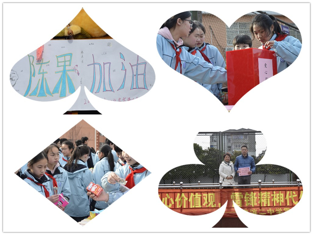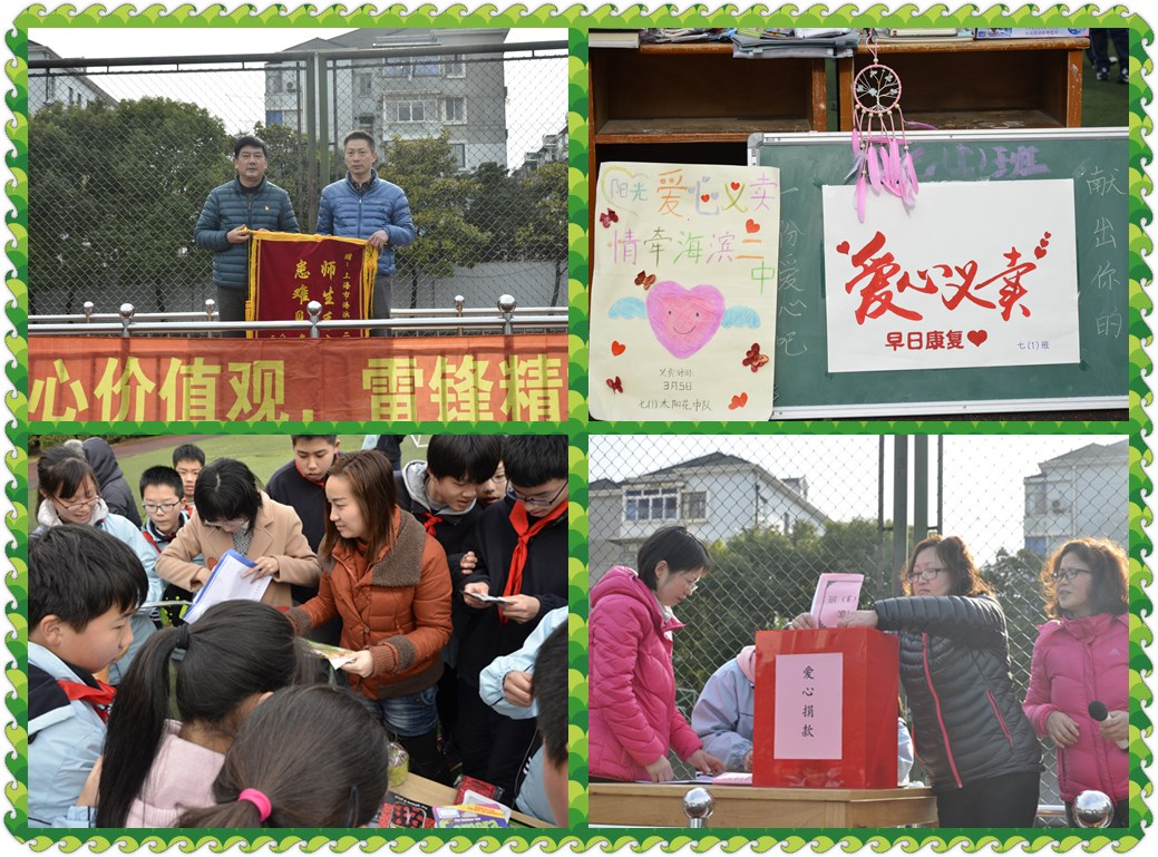 3月5日是学雷锋纪念日,为了传承雷锋精神,践行核心价值观,海滨二中全体师生开展以“爱心校园,助力同学渡过难关”为主题的学雷锋义卖公益活动。帮助我校八(2)班学生小陈,他在2017年6月被诊断患脑部恶性肿瘤入住新华医院,手术后在半年时间内相继进行了6次化疗,与病痛进行了顽强的斗争。