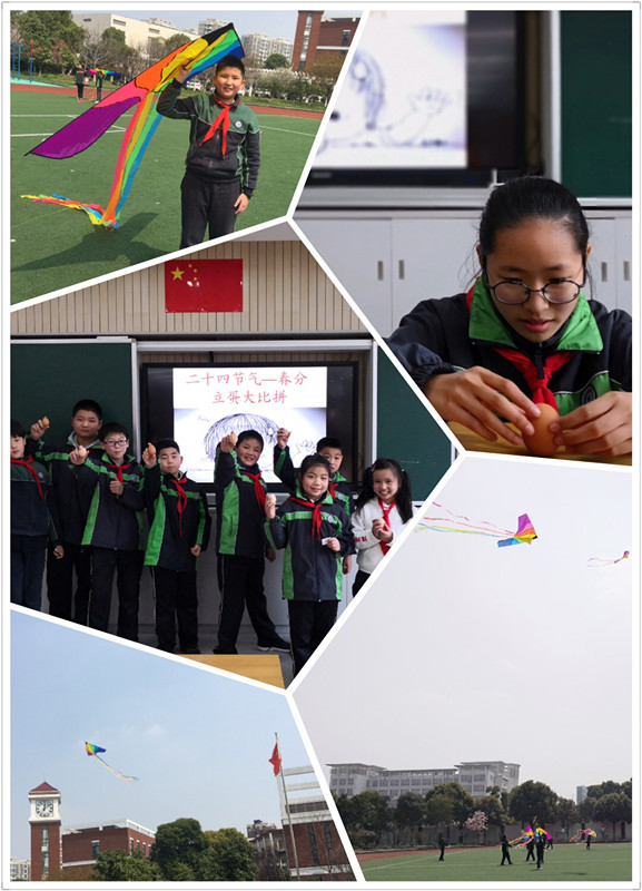 春分,是春季九十天的中分点。二十四节气之一,在每年农历二月初五日前后,春分有立蛋和放风筝的习俗。3月21日,正值春分,在团支部、大队部的组织下,我校举办了“春分立蛋”、“放飞风筝”的活动。在老师讲解了春分的起源、习俗与立蛋的玩法后,大家大展身手。同学们两手拿着蛋,轻轻地立着放在桌子上,一次、两次、三次……一次次失败,一次次尝试,大家乐此不疲。每当有同学将鸡蛋立起来,大家都惊奇地欢呼,也更加有毅力,拿着鸡蛋小小翼翼地放在桌子上,试图让它站立。春分前后也是放风筝的好时节,在校大队委员的带领下队员们扎风筝,画风筝,通力合作,一大早就在操场上忙活开了,看着风筝飞向高高的蓝天,同学们心中都乐开了花。