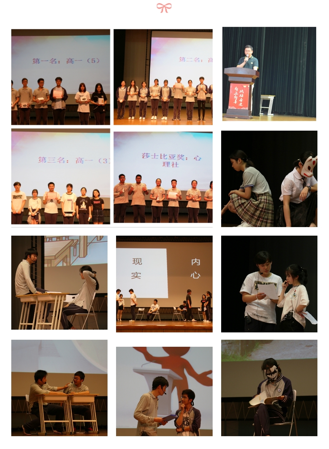 此次心理剧大赛紧扣“戏剧点人生”主题,各班群策群力、脑洞大开,呈现了特色鲜明、主题各异的心理剧。内容涉及分班后的同伴关系处理;由于太优秀而引发的自我发展困扰;关于强势妈妈、怂爸爸、好学生、坏学生的探讨;对学习生活是不是只有学习的探索;对讨好型女孩的分析;对父母与子女价值观冲突的探索;师生关系的思考;宿舍生活的分享;“不好好读书,将来就没有出息”这句话的思考。这场比赛从不同视角、不同关系,让我们看到高中生的不同面向。