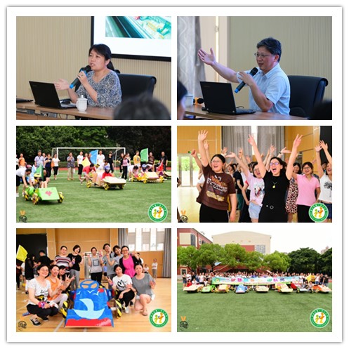 暑期培训的第二天主题为“智慧联合,团队亮剑”团队体验活动。全体教师在专业教练的带领下热了身,放松了心情。在经过破冰游戏之后,教师们跨学科随机分成了8个小组,一个个极具巧思的队名,一句句朝气蓬勃的口号,一连串英姿飒爽的队形,无不展现出了一中心老师们的智慧与活力。在整个“赛车制作”的过程中,全体教师们团结协作、创意无限。在经过两小时的画、钉、拼、裁、贴后,8辆造型前卫的赛车横空出世。最后,赛车试跑比赛将今日的团队体验活动推向了高潮。在教师们热情澎湃的啦啦队舞姿与此起彼伏的助威声中,8辆赛车冲出了起点,在绿草地间驰骋!