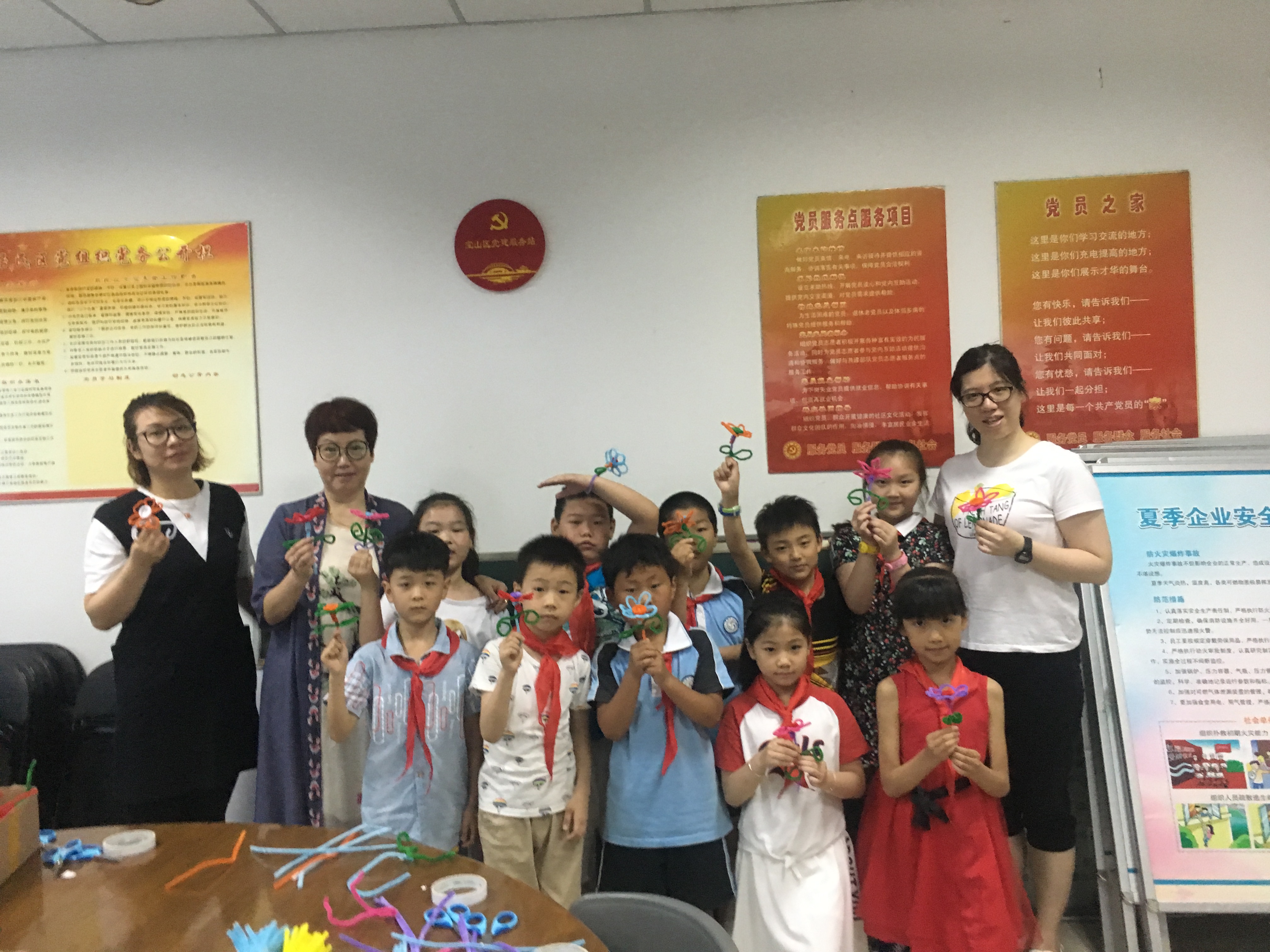 一部分同学在社区工作人员及学校党团员老师的带领下,来到新桥居委会体验扭扭棒的乐趣,党员老师在社区里对孩子进行教学,同学们其乐融融,社区的工作人员还向同学们介绍了各行各业不同阶层的劳动者,让同学们深知劳动是最光荣的事情;大家兴高采烈的变幻手中的扭扭棒,虽然脸上流出了汗珠,但小脸上却露出开心的笑容。