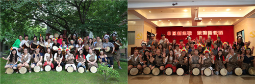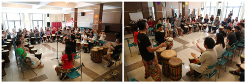 培训现场,几十架非洲鼓的摆放、非洲人文视频的播放、导师们非洲特色的着装……瞬间让学员们身临其境,感觉置身于非洲原始部落。培训中专业的非洲鼓点一响,瞬间点燃了每一位学员的热情:非洲鼓基础打击方法学习、即兴团队组合、非洲特色装扮、非洲舞蹈创编、非洲歌曲学唱…………学员们全情参与,深刻体验,感受到了浓郁的非洲文化。