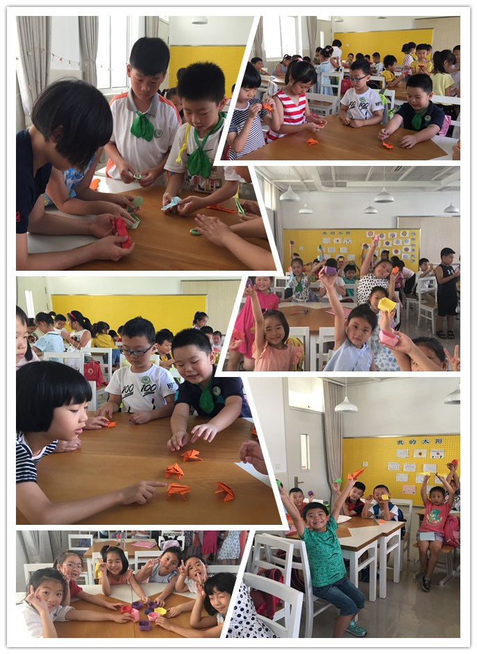 一年级小朋友在美术老师的指导下进行折纸活动。别看他们年龄小,动手能力却很强。不一会儿,小手表、小青蛙、小纸盒就在他们的巧手中诞生了。看着自己的成果,孩子们乐得眉开眼笑。