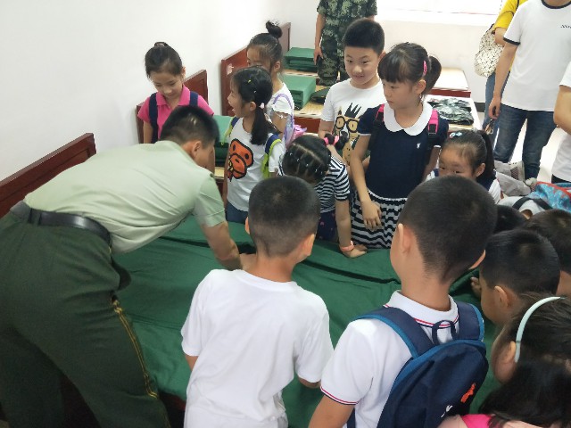 小朋友们首先观看了士兵们的队列训练,整齐的步伐,响亮的口号,战士们各个精神抖擞,士气高昂,接着参观官兵的休息室和更衣室,当孩子们看到兵哥哥的床铺得十分整齐,地板也一尘不染。对兵哥哥满心的佩服,小朋友跟着示范有模有样的学着叠被子,看到床上的军帽有些孩子情不自禁的拿起戴一戴,家长拿起了相机记录着孩子的瞬间,活动尾声的时候,兵哥哥手把手教孩子遇到坏人怎样逃离,让孩子们学到了防范本领。