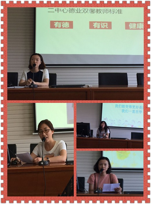 本次活动由全国名师、区学科带头人吴旻烨老师主持,她首先为大家解读了“二中心德业双馨教师标准”:要“有德”,做学生健康发展的引路人;“有识”,做内涵丰富的特色教师;“健康”,实现快乐精彩的教育人生。二中心德业双馨标准要求教师们以德立身,既做学问之师,又做品行之师,为学生的幸福人生奠基。接着,三位优秀骨干教师代表结合自身的教育教学经历,讲述了对新时代师德的理解。大队辅导员朱老师回忆起少先队活动中和孩子们的亲密接触,告诉大家要因材施教,充分挖掘每一个孩子的潜力点,发现他们的闪光点,让有温度的教育,滋润孩子的童心。美术骨干杨老师通过一个个生动感人的小故事,让大家看到学校OM团队背后一群师德高尚、爱岗敬业的年轻教师。正是她们不计报酬的辛勤付出,才能带领学生们走上世界的领奖台。青年骨干樊老师和大家一起分享了她帮助一个孩子走出心理阴影,让其充满正能量的故事。