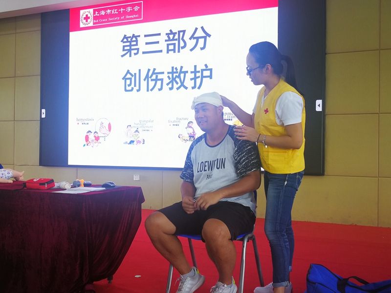 培训前,区红十字会工作人员为每位教师发放教材《救护员》以及急救包,对红十字相关知识进行广泛的宣传。在随后的培训会上,医护人员从拨打急救电话注意事项讲起,围绕红十字会基本知识、救护新概念、心肺复苏术、创伤救护等方面作了深入浅出的讲解。通过观看示范和实际操作,老师们学习了止血、包扎、骨折固定、伤员搬运等基本技能,还掌握了应急救护概念及中毒、触电、溺水、烧伤、烫伤等常见意外伤害的处理常识。最后在红十字医护人员带领与帮助下开展现场急救,老师们亲身体验心肺复苏术基本操作的模拟练习,进一步巩固了学到的技能。